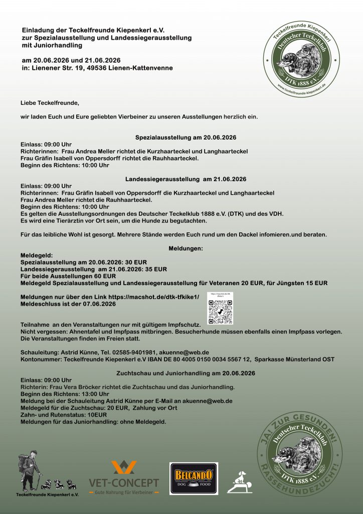 Wir haben den QR Code für die Anmeldung auf https://macshot.de/dtk-tfkike1/ erneuert. Meldeschluss für Spezialausstellung und Landessiegerausstellung ist der 07.06.2026